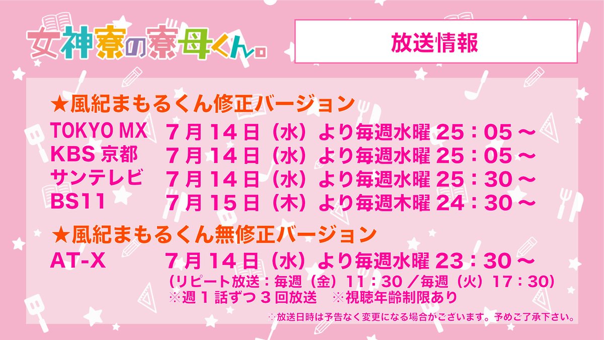 アニメ【女神寮の寮母くん。】7月14日25時5分より放送開始。放送局や配信サイトにより「修正バージョン」「シースルーバージョン」「無修正バージョン」に別け放映