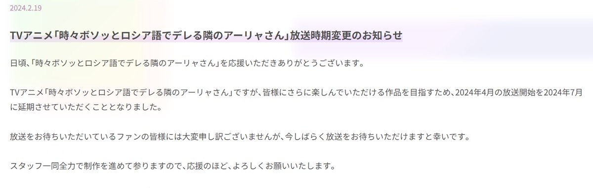 TVアニメ『時々ボソッとロシア語でデレる隣のアーリャさん』放送時期が4月から7月に延期