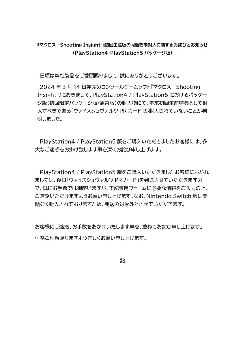 (PlayStation4・PlayStation5パッケージ版) pic.twitter.com/uJ1OMQ4zZV— 「マクロス -Shooting Insight-」 official (@MACROSS_SI) March 12, 2024