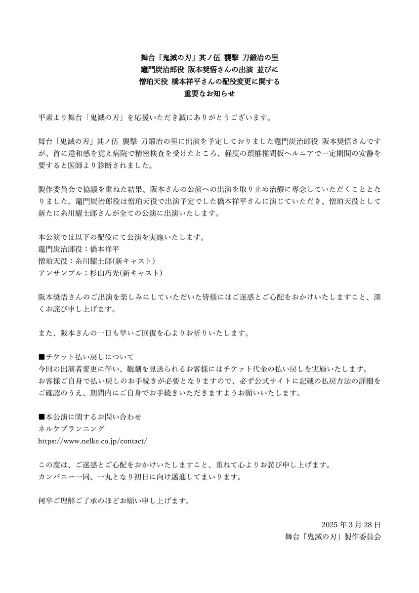 — 舞台「鬼滅の刃」公式 (@kimetsu_stage) March 28, 2025