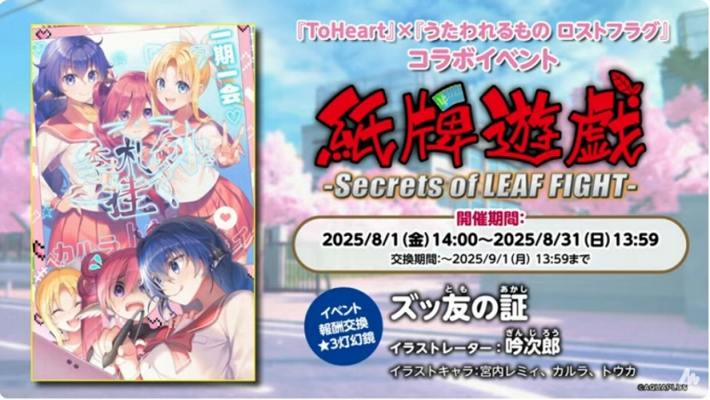 【うたわれるものロストフラグ】「ToHeart」コラボが明日8/1より開催。イベントタイトルは「紙牌遊戯Secrets of LeafFight」リーフファイト!? コメントを残す スポンサードリンク カードゲーム実装はないかぁ~。 Tweet スポンサードリンク