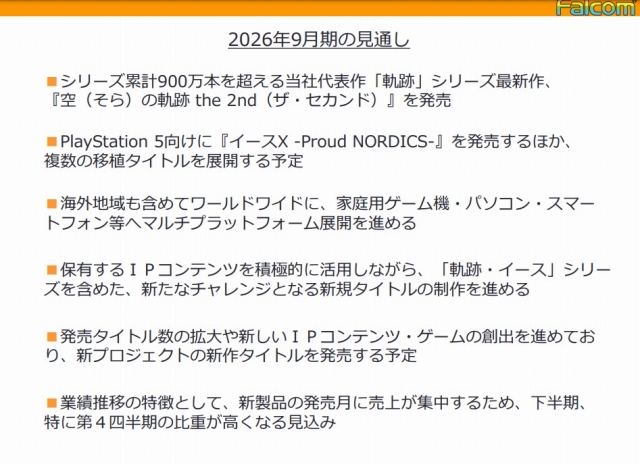 日本ファルコム『空の軌跡the 2nd』2026年9月期に発売と発表 4件の返信 スポンサードリンク 2025年9月期 決算補足説明資料 早っ! 1stから間がないのは素晴らしい。 Tweet スポンサードリンク